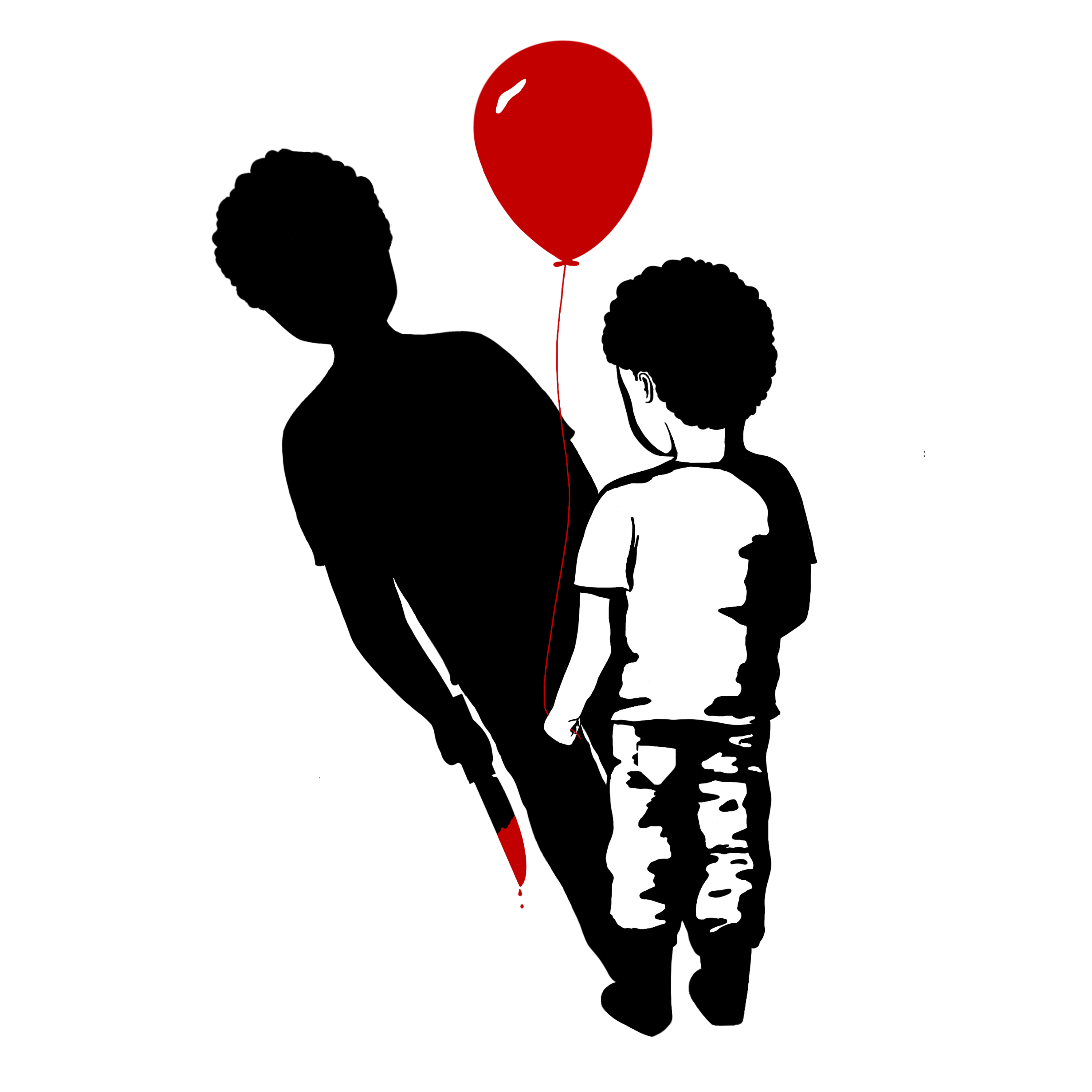 In my illustration, I chose to represent a young boy holding a balloon, symbolizing the innocence of childhood. The child looks at his own shadow and sees its future self, not as a playing child, but as a boy with a bloody knife. A contradiction that shows how it should actually be; the playing child, and how the situation actually is and will be in the future; children or young people with knives.