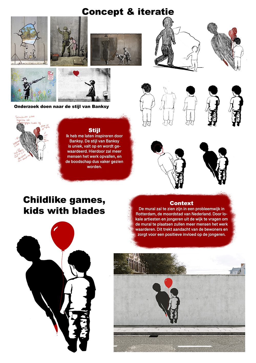 Banksy has greatly inspired me because there is a deep meaning behind all of his works. His works stand out because he has a specific style, and people respect his works. For my mural, it was important that people understood that there was an important meaning behind it and that the residents respected the mural so that it would remain visible for a long time. This led me to create a new ‘Banksy’ for my assignment, blending his iconic style with my own message.