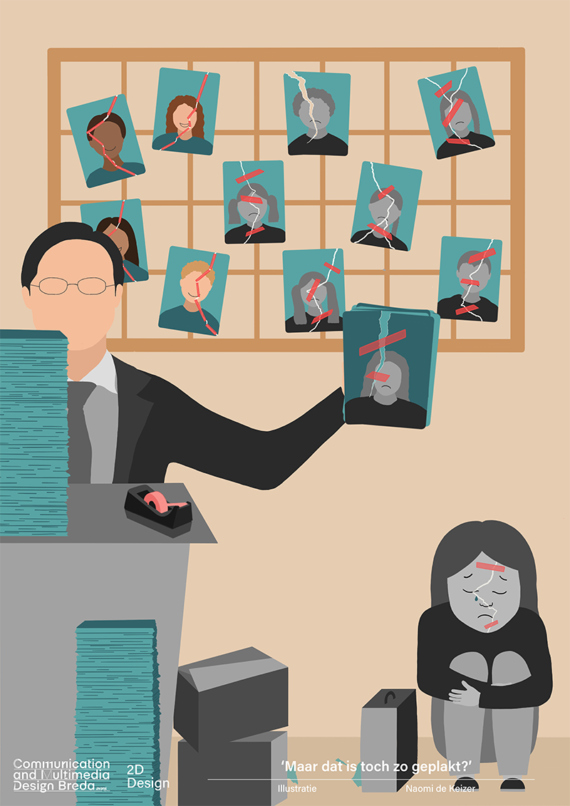 For my school project about 2D Design i’ve created a poster called ‘Maar dat is toch zo geplakt?’ or ‘But isn’t that just simply pasted on?’. An illustration reflecting the lack of attention and time devoted to youth care.