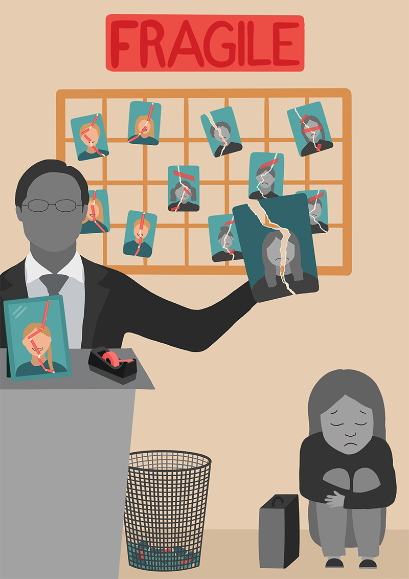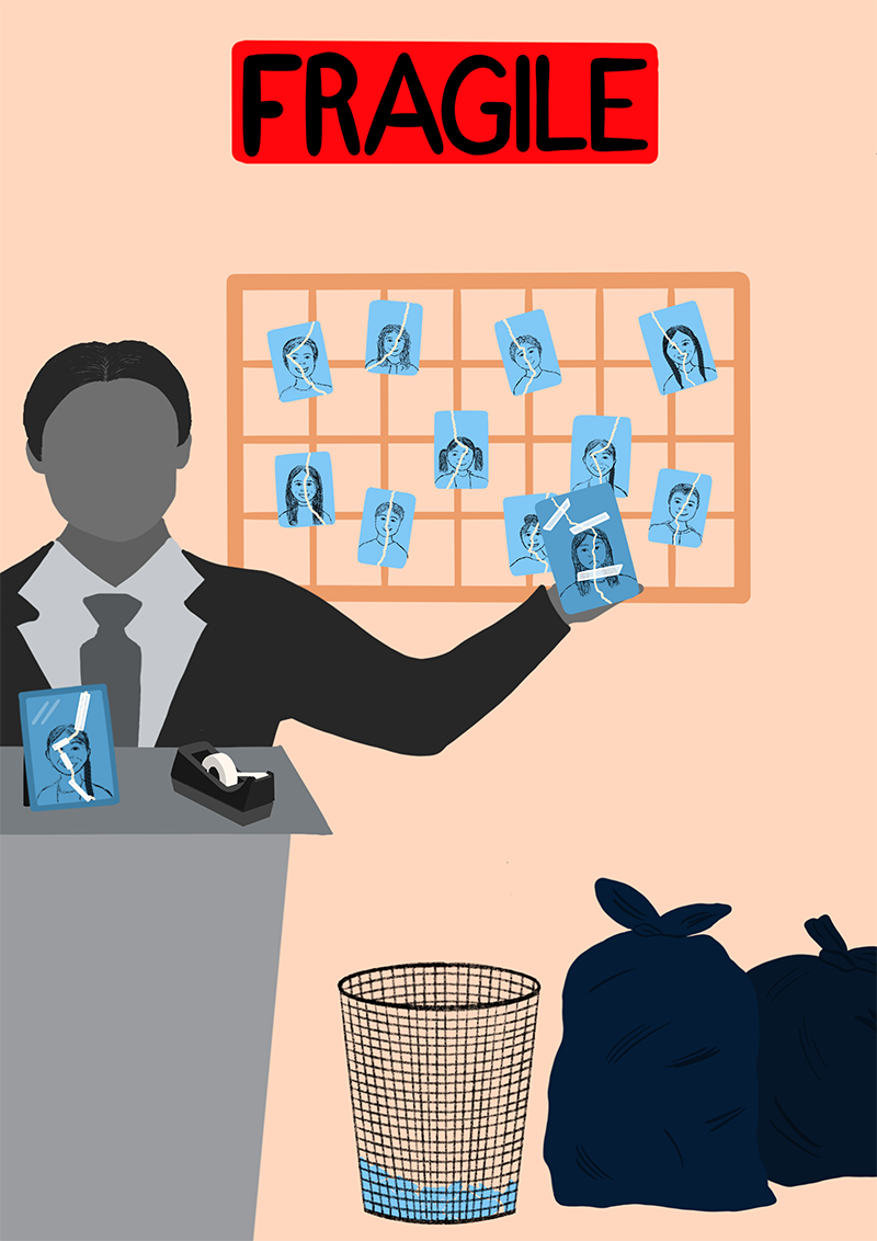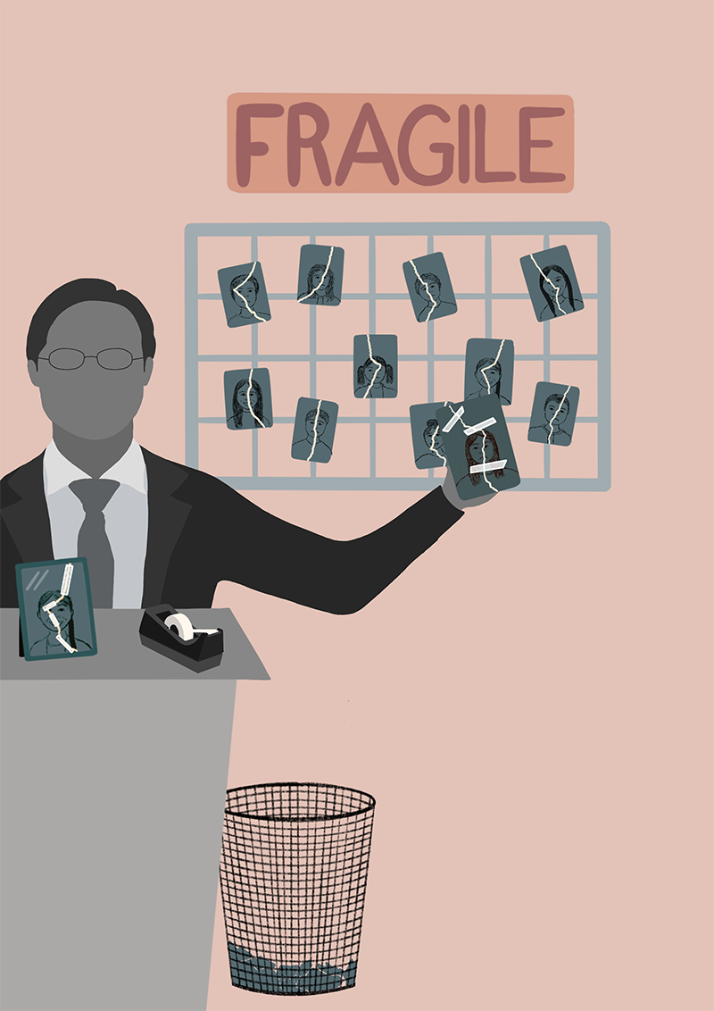 With this illustration, I aim to communicate the message that there is insufficient attention and care given to youth welfare. There is a tendency to overlook these issues, and I wanted to represent this in a creative manner. In the image, you see a man resembling our former prime minister, symbolizing the government. Surrounding him are various torn pictures of children. The pictures on the left are carefully repaired, these children appear happy. Conversely, the pictures on the right are quickly and roughly affixed, with the children looking sad and very miserable. Through this metaphor, I intend to emphasise the need for time and attention in ‘repairing’ these damaged children in the realm of youth welfare.