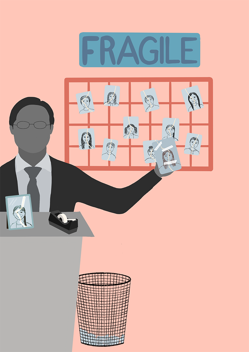 To reinforce this message, I added a crying girl in the corner. She carries a suitcase, symbolizing youth welfare and the many children who lack a stable place to live. Additionally, you see numerous boxes and stacks of photos, indicating the vast number of children in need of assistance.